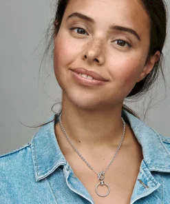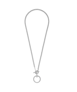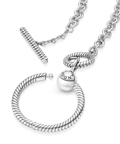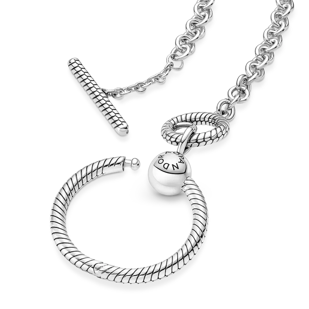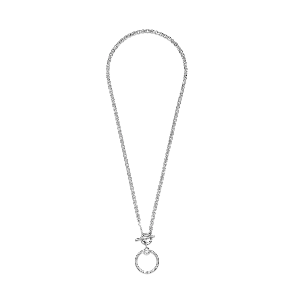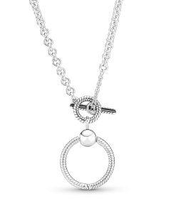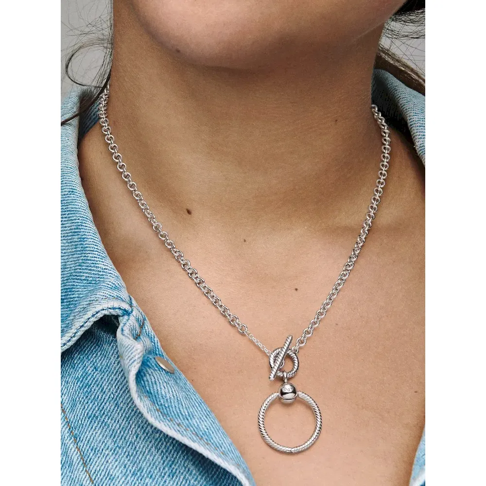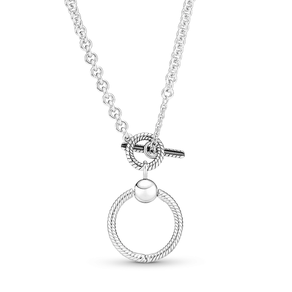 Wear your story close to your heart with the Pandora Moments O Pendant T-bar Necklace. For the first time ever, we’ve combined two iconic charm holders in one necklace, so you can take personalisation to the next level. Style six of your favorite charms, dangle charms or pendants on the necklace, three on the chain and a maximom of three on the small O pendant. The O pendant opens with a ball clasp closure. The chain is opened by rotating the T-bar – to add charms, dangle charms or pendants, simply slide them over the T-bar.