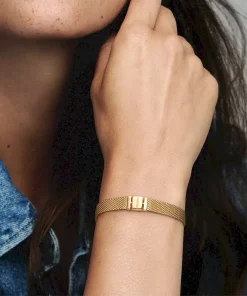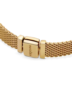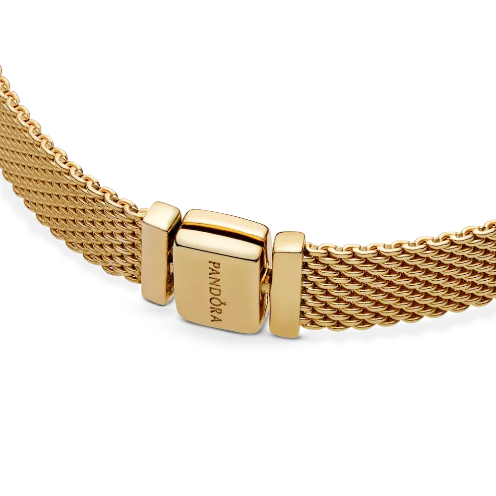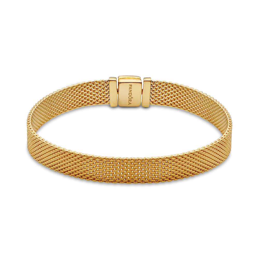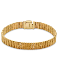 Pandora Reflexions is a modern way to reflect who you are. This versatile Reflexions Mesh Bracelet holds clip-on charms that sit flush to mirror your style – whatever shape it takes. Plated with 14k gold for a luxe finish, this piece looks equally cool worn alone or stacked with other bracelets. Weave your story into your style and go gold and bold, adding your favourite charms from the collection.