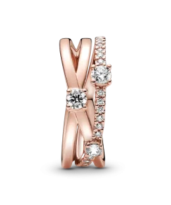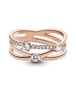 For a classic touch, go for the Sparkling Triple Band Ring. Hand-finished in 14k rose gold plating, this style features three interlinked rings. Small clear cubic zirconia decorate the top of one ring shank, while three bigger stones are set across all three for extra sparkle. As this wide-band ring has a pre-stacked look, teaming it with other shimmering Pandora Timeless rings will make a bold statement.