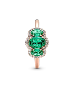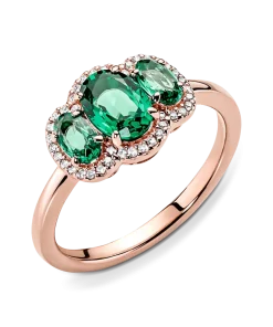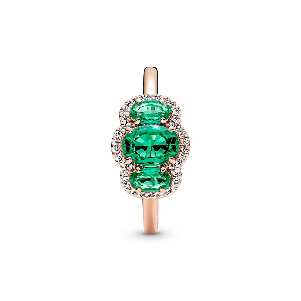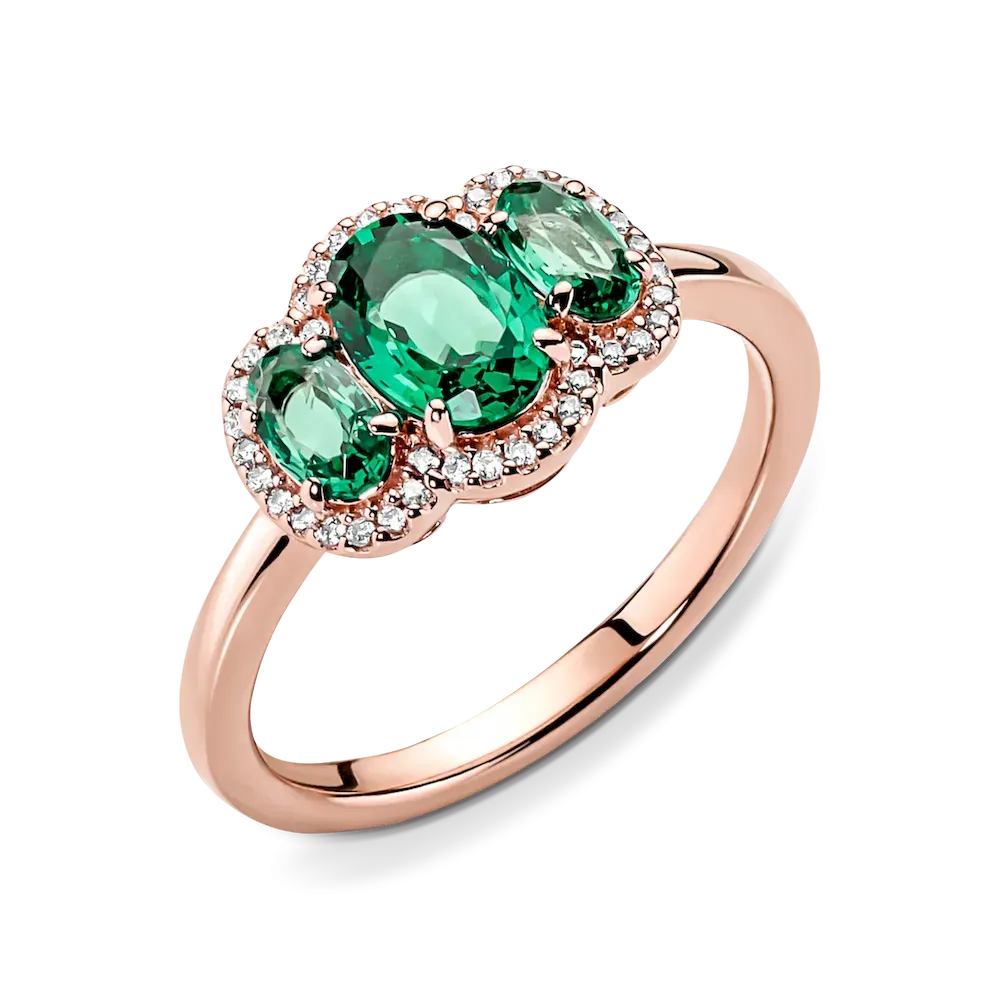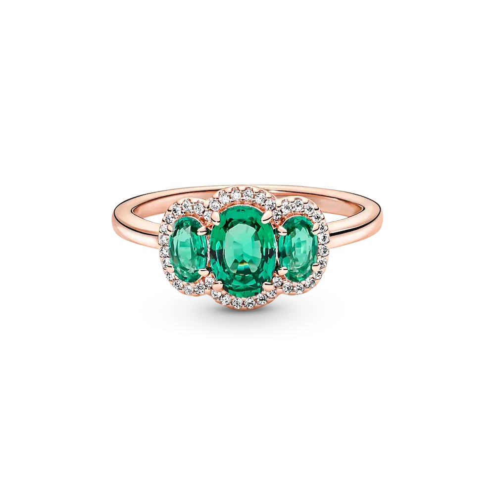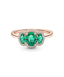 Elevate any look with the Three Stone Vintage Ring. Hand-finished in our 14k rose gold-plated unique metal blend, this ring is set with two oval cut green crystals on either side of a large oval green center stone. A clear pavé halo frames the three stones, while a thin band and open sides on the basket holding the stones give the ring a delicate look. Wear it solo or stack it with other styles to make a statement.