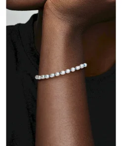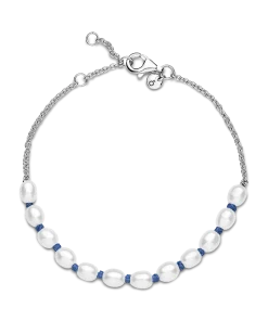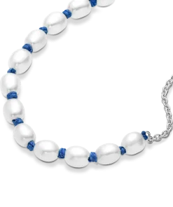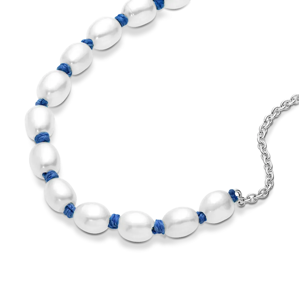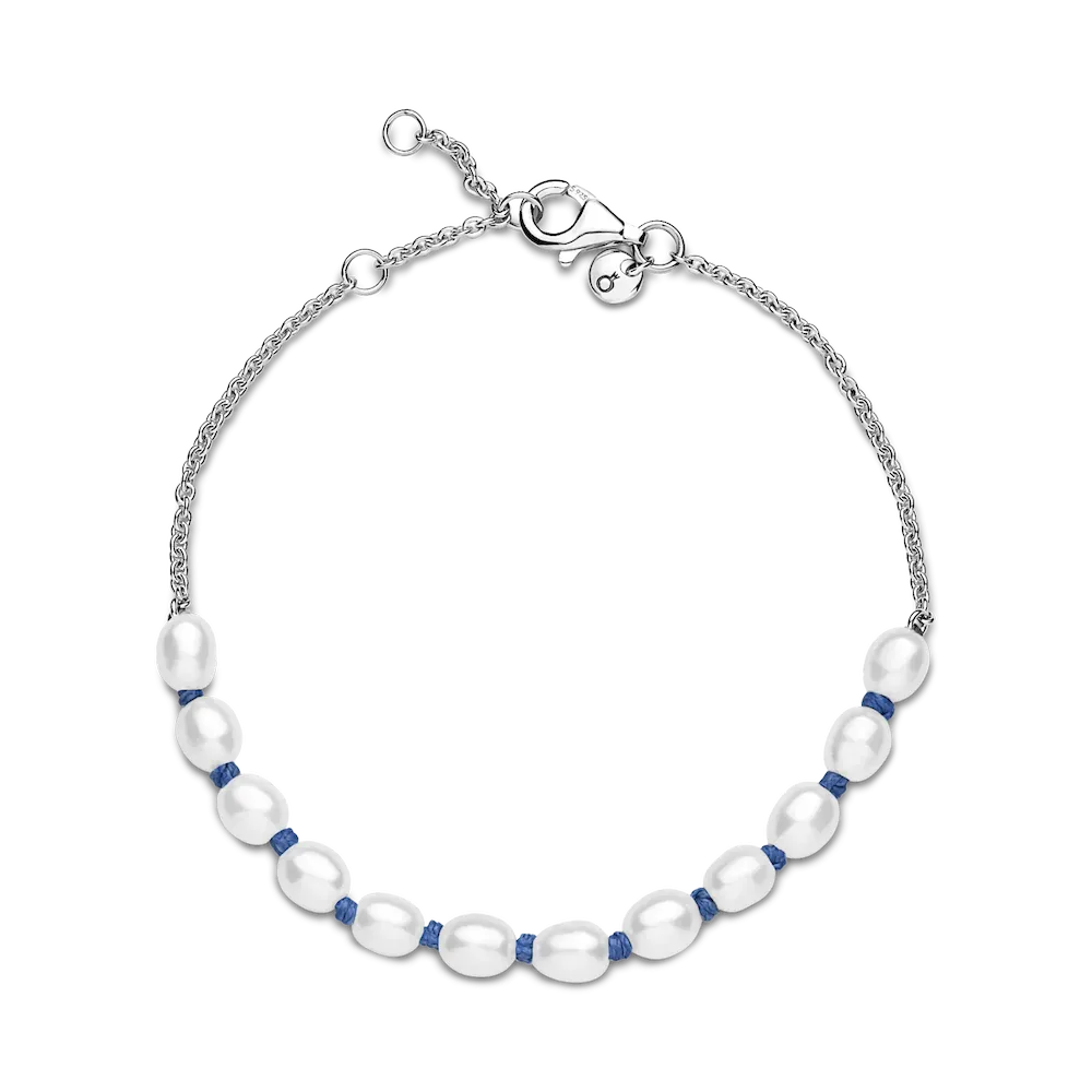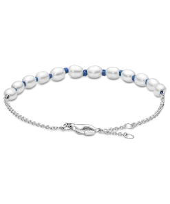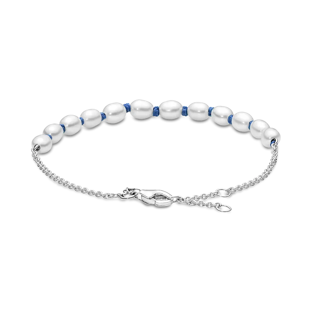 Introducing the perfect pearl statement to layer into your looks. Inspired by sunny days on the beach, one half of this pearl bracelet features a row of treated freshwater cultured pearls strung onto knotted blue cord. The other half is a sterling silver chain with an easy lobster clasp closure, featuring a small disc near the clasp engraved with the Pandora Crown O. Note: normal wear and tear may occur with natural materials such as treated freshwater cultured pearls. The relevant treatments for treated freshwater cultured pearls are bleaching or dyeing and luster enhancement.