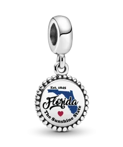 In a Sunshine State of mind. This sterling silver dangle charm features a state-shaped silhouette in glossy blue enamel with “Florida” beautifully scripted in black, and a small red heart underneath. Forever a reminder of your favorite place, perfect for styling on a favorite Pandora bracelet or necklace.