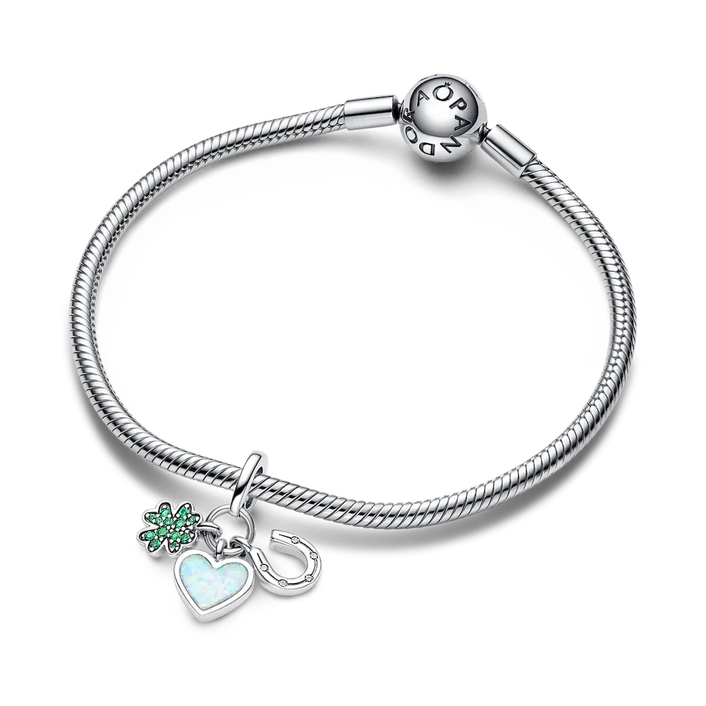 Keep luck close with the Four-leaf Clover, Heart and Horseshoe Triple Dangle Charm. This sterling silver dangle charm features three different symbols of good fortune including a four-leaf clover, a heart and a horseshoe. The heart is engraved with the word