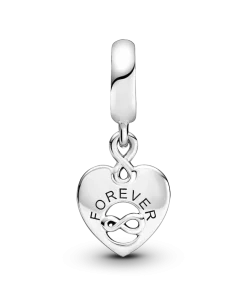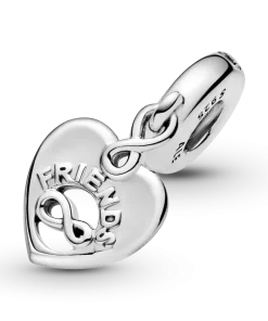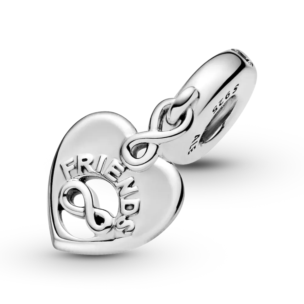 Discover a special charm for your BFF with the Friends Forever Heart Dangle Charm. Hand-finished in sterling silver, this heart-shaped dangle includes an asymmetric infinity sign cut-out with “Friends” in raised lettering on the front and the engraving “Forever” on the back. Another infinity sign connects the dangle with the bail, which features a sparkling clear stone. Let your bestie know that your friendship will last a lifetime with this piece.