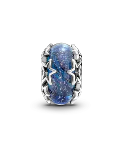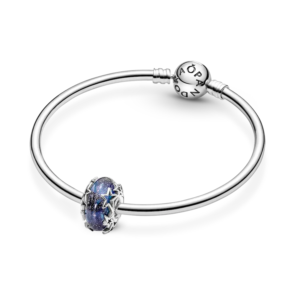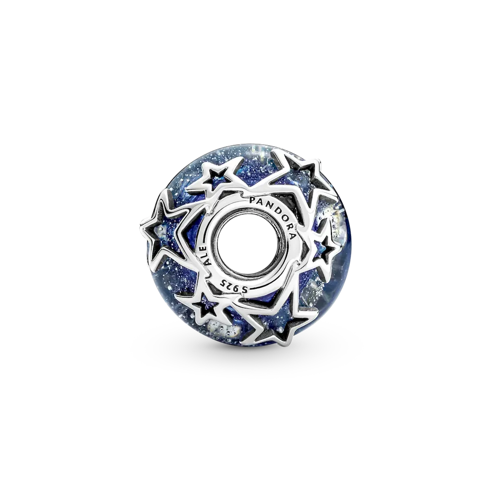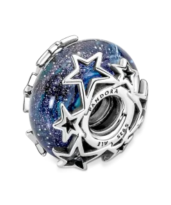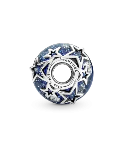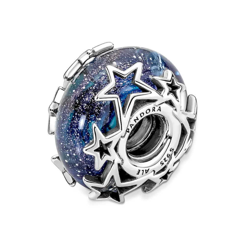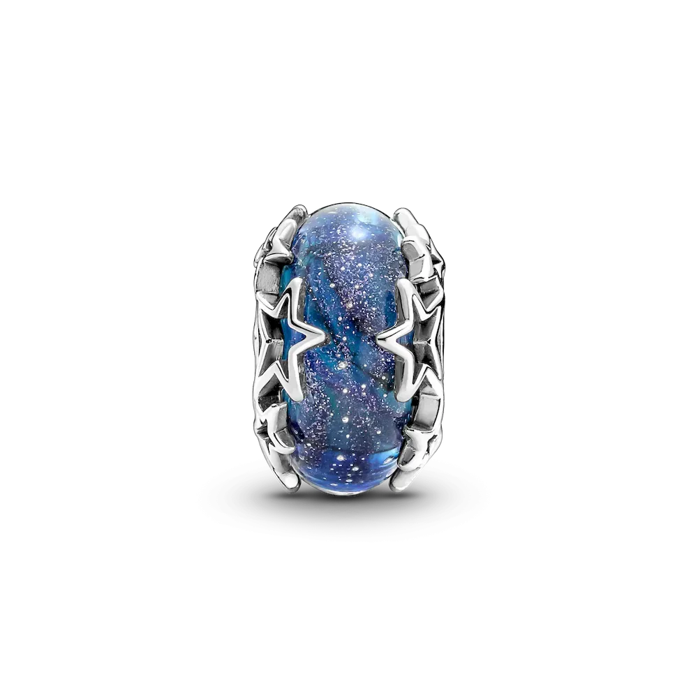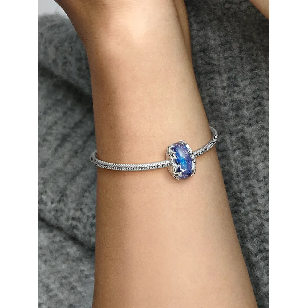 This striking Galaxy Blue & Star Murano Charm reflects the beauty of the night skies. Hand-finished in sterling silver, the galaxy-inspired charm features glittery blue Murano glass surrounded by asymmetric cut-out silver stars of different sizes. Wear this charm to stay connected to the power of the stars and planets of the galaxy no matter where in the world you are, or gift this charm to someone special to show you care.