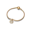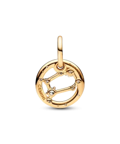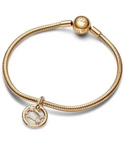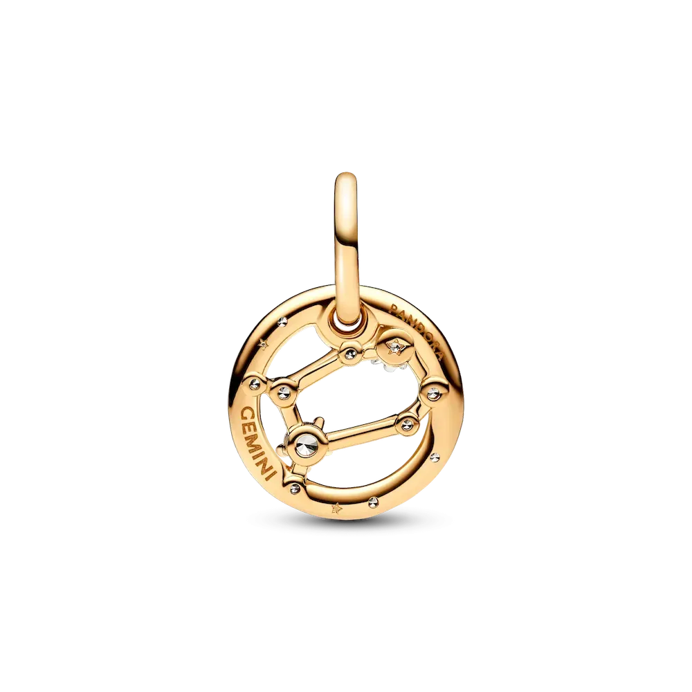 Let the stars guide your look with the Gemini Zodiac Dangle Charm Bracelet Set. This Pandora Moments dangle charm is crafted from our 14k gold-plated unique metal blend, has a circular outer frame and features clear sparkling cubic zirconia as well as the shape of the Gemini zodiac sign. The back side of the frame is engraved with