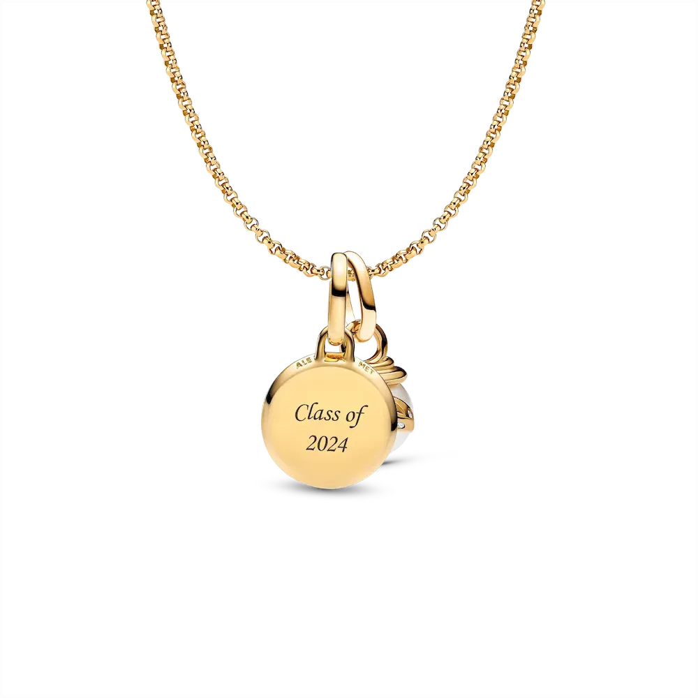 Inspired by the beauty of natural gemstones and the unique symbolism each one holds, this 14k gold-plated set features a malachite-inspired mini medallion dangle charm with a wavy green stone effect and an engravable back. It comes with the Pandora ME Snake Pearlescent Mini Dangle Charm, a combination of elegance and edginess, the snake head wraps around the top of a lacquered artificial pearl with grooved detailing on the head and sparkling stones as eyes. Styled on the Rolo Chain Necklace in a matching finish for added shine.