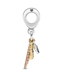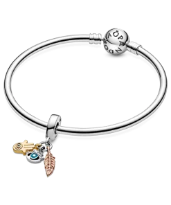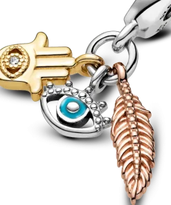 Show you’re a true citizen of the world with the Spirituality Dangle Charm, featuring a hamsa hand, all-seeing eye and feather. Feel the powerful symbols protecting you at every step when you wear this tri-coloured charm in 14k gold plating, 14k rose gold plating and sterling silver. Featuring clear cubic zirconia for extra sparkle and blue enamel details on the all-seeing eye, this charm is inspired by inclusive spirituality and embracing different faiths.