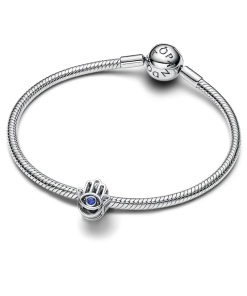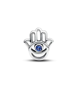 Tap into protection and positivity with our sterling silver Hamsa Hand Charm. Featuring an openwork design and blue man-made crystals, let it be your guiding light to strength and serenity.