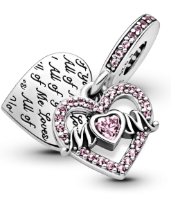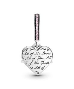 Surprise her with the Heart & Mom Dangle Charm. Hand-finished in sterling silver, the heart-shaped front disc is outlined with pink crystals and features “Mom” script with the “U” replaced by a heart set with a matching stone. The engraving “All of me loves all of you” features on the back heart-shaped disc in a repeating pattern. A row of pink sparkling stones features on the bail. Put a smile on your mom’s face with this colorful design.