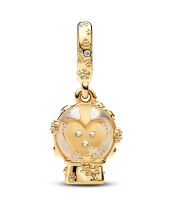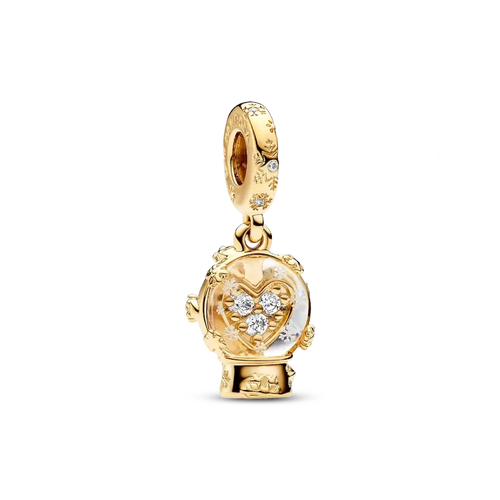 Embrace the nostalgia of festive days of old with the Heart Snowflake Snow Globe Dangle Charm. Plated in 14k gold, this Murano glass snow globe charm features engraved snowflakes that capture the beauty of a winter wonderland. The snow globe is inspired by our existing sterling silver snow globe charm with a new twist: it features a heart inside the Murano glass with three clear cubic zirconia stones. This special festive charm adds the perfect touch of sparkle to any look – just in time for the holidays.