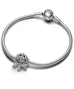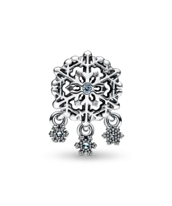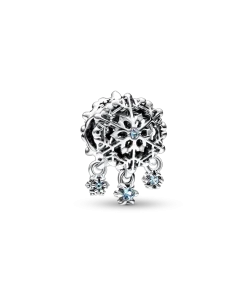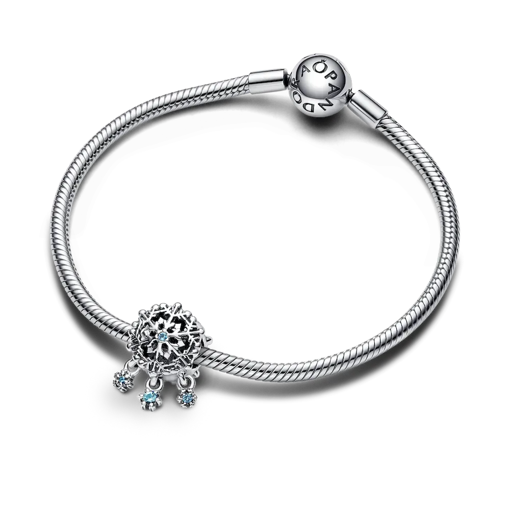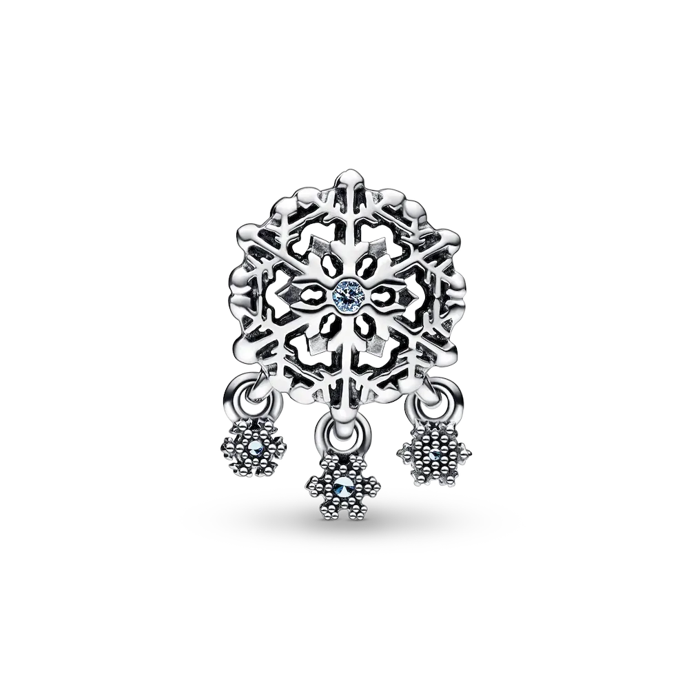 A celebration of the beauty and uniqueness of nature, this hand-finished Icy Snowflake Drop Charm features an intricate cut-out snowflake in sterling silver, set with a sparkling pale blue man-made crystal on each face and with cut-out snowflake details around the sides of the charm. Three smaller snowflakes dangle from the charm, bringing a sense of movement that recalls snowflakes swirling in the frosty air – each dangle is subtly different and contains a man-made crystal. Wear it on your winter-inspired jewelry styling as a reminder to celebrate what makes each of us unique.