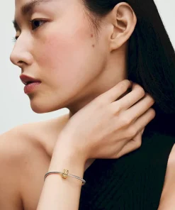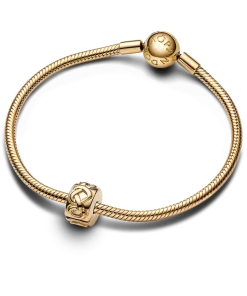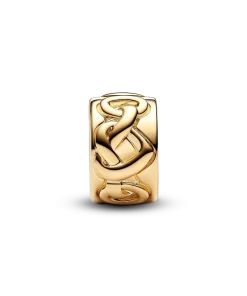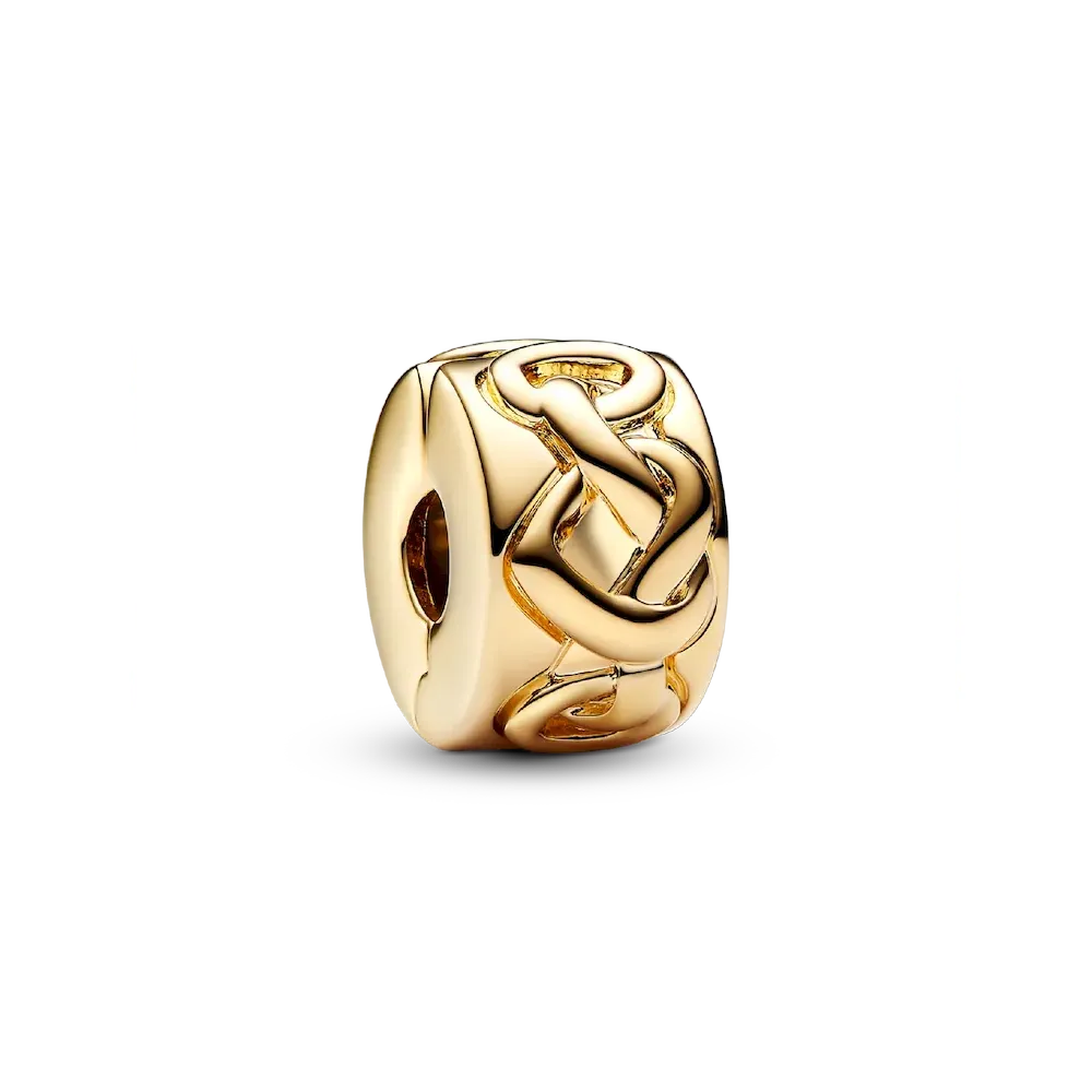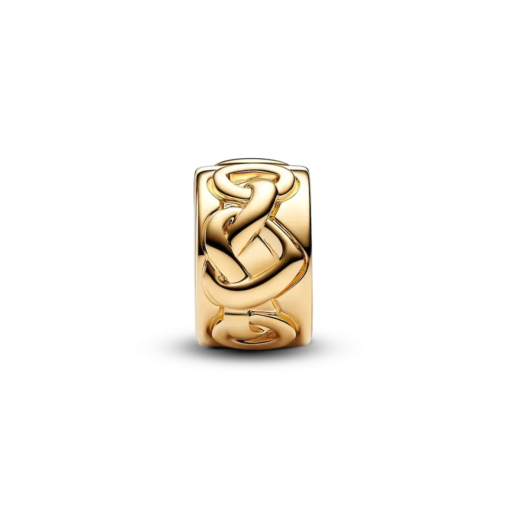 Our simple yet striking Pandora Moments clip charm is decorated with a row of knotted hearts. The design features a combination of the iconic heart and the classic love knot, which gives the piece extra emotional appeal. The 14k gold-plated charm is perfect for adding a heartfelt touch to your bracelet collection and helps to evenly space out your stack. This clip charm features no silicone grip, so it will slide if not styled onto threads (two raised charm dividers).