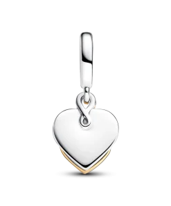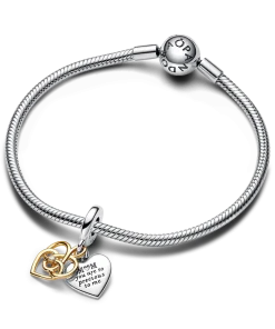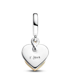 The power of motherly love shines bright in our Lab-grown Diamond Engravable Mom Double Dangle Charm. Featuring a 14k gold-plated heart motif on a heart-shaped disc intertwined with a knot-inspired openwork heart, it embodies the infinite love for Mom. A 0.009 ct lab-grown diamond shines at the center, symbolizing her preciousness. The other disc crafted in sterling silver carries a heartfelt engraving that reads