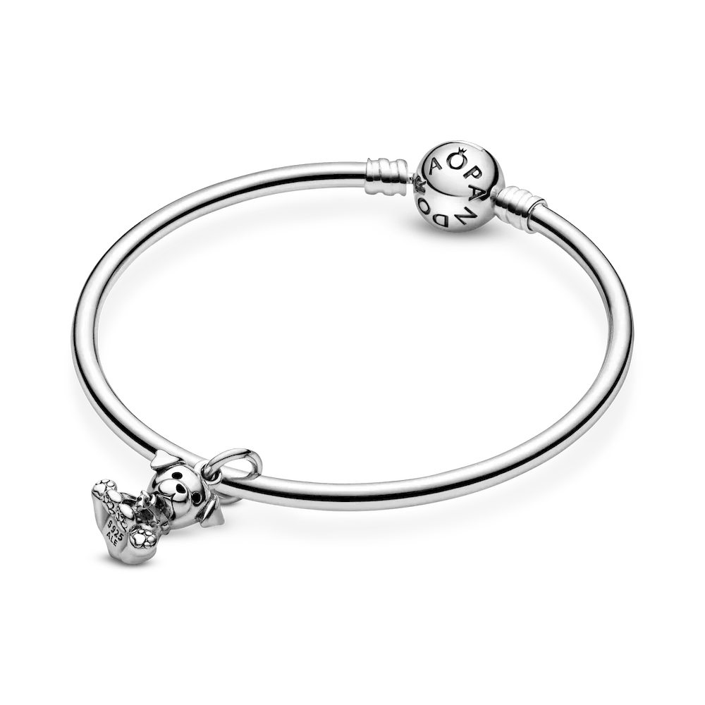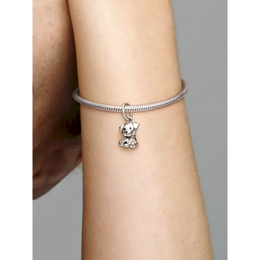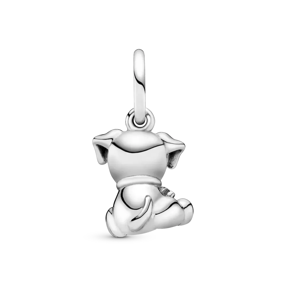 Make your favorite pet or animal a part of your style story with our Labrador dog charm. The adorable sterling silver puppy wears a dangling bone-shaped collar detailed with hand-applied black enamel and its paws are embossed with hearts. Wear the charm as a heartfelt reminder of your four-legged best friend on your favorite Pandora Moments bracelets and bangles.