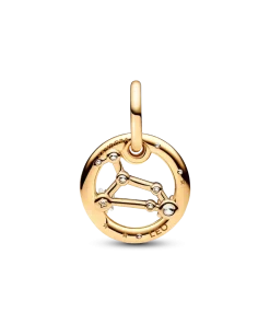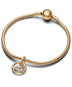 Let the stars guide your look with the Leo Zodiac Dangle Charm. This Pandora Moments dangle charm is crafted our 14k gold-plated unique metal blend, has a circular outer frame and features clear sparkling cubic zirconia as well as the shape of the Leo zodiac sign. The back side of the frame is engraved with