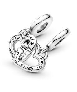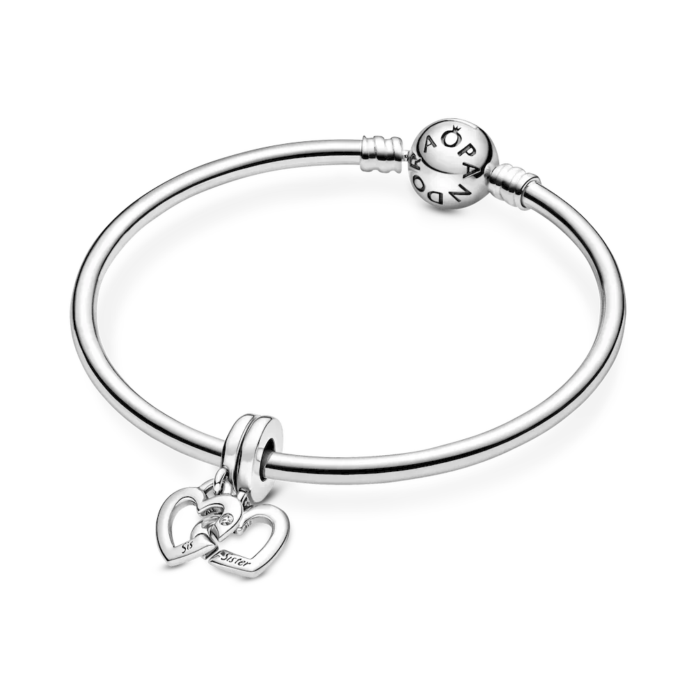 Show off your sisterly bonds with the Linked Sister Hearts Split Dangle Charm. Hand-finished in sterling silver, this charm includes two linked open hearts, each featuring a sparkling clear cubic zirconia stone and engraving (one says