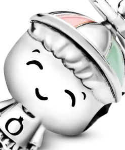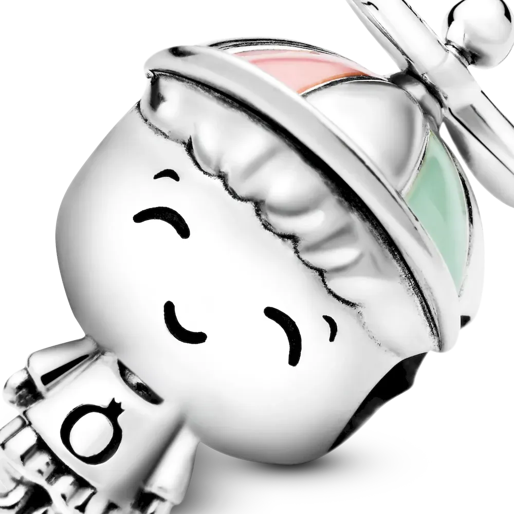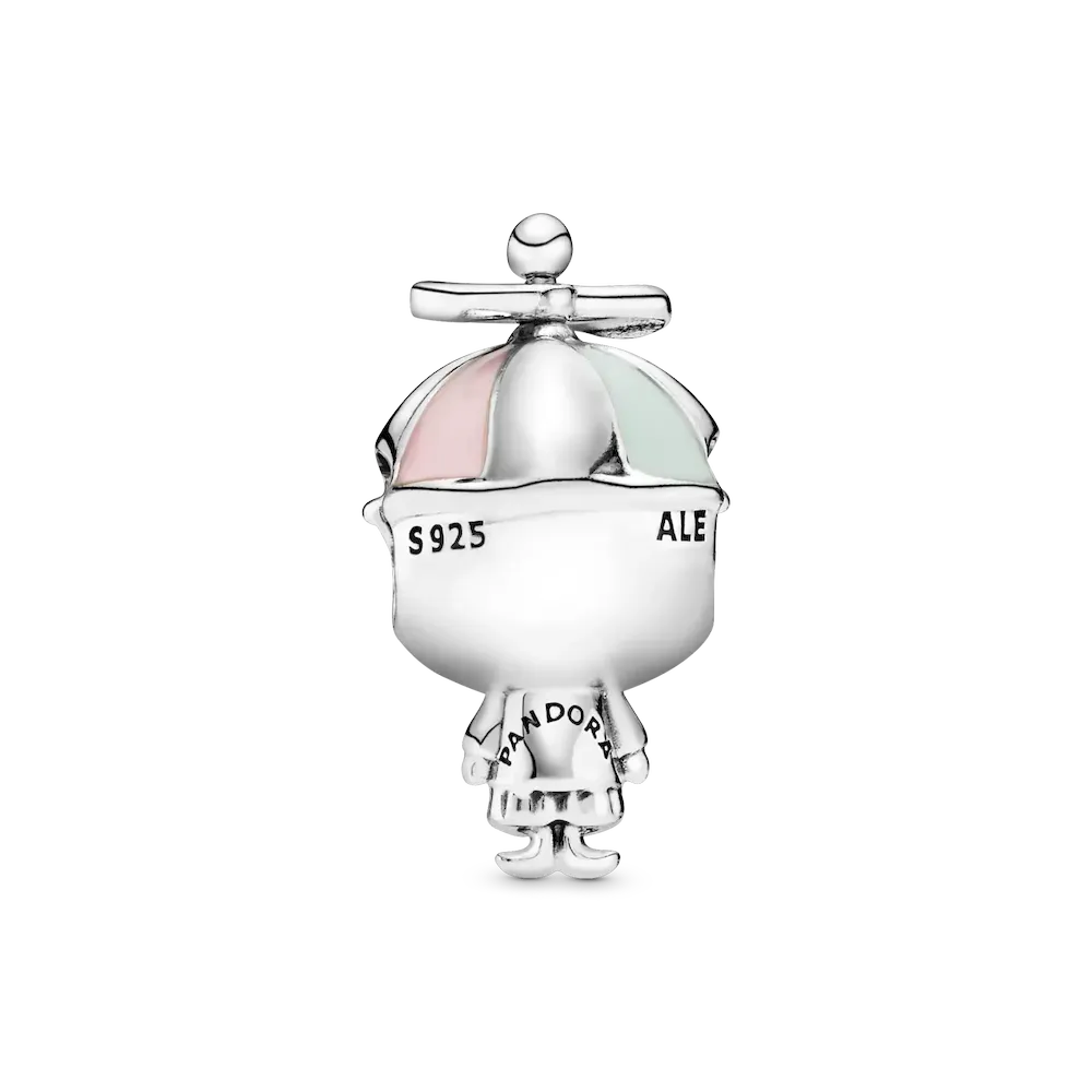 Add boyish charm to your bracelet with our character charm in sterling silver. The boy charm is topped with a rotating propeller cap in pastel-toned enamel and detailed on his belly with our Pandora crown O monogram. The charm threads onto your Pandora Moments bracelet through the head, leaving the body to dangle playfully with your every move.