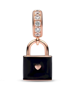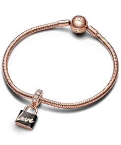 Celebrate your everlasting love with our Love Padlock Dangle Charm. This 14k rose gold-plated padlock is hand-finished with black enamel, accentuating the polished lifted script across the front and heart on the back. The script reads