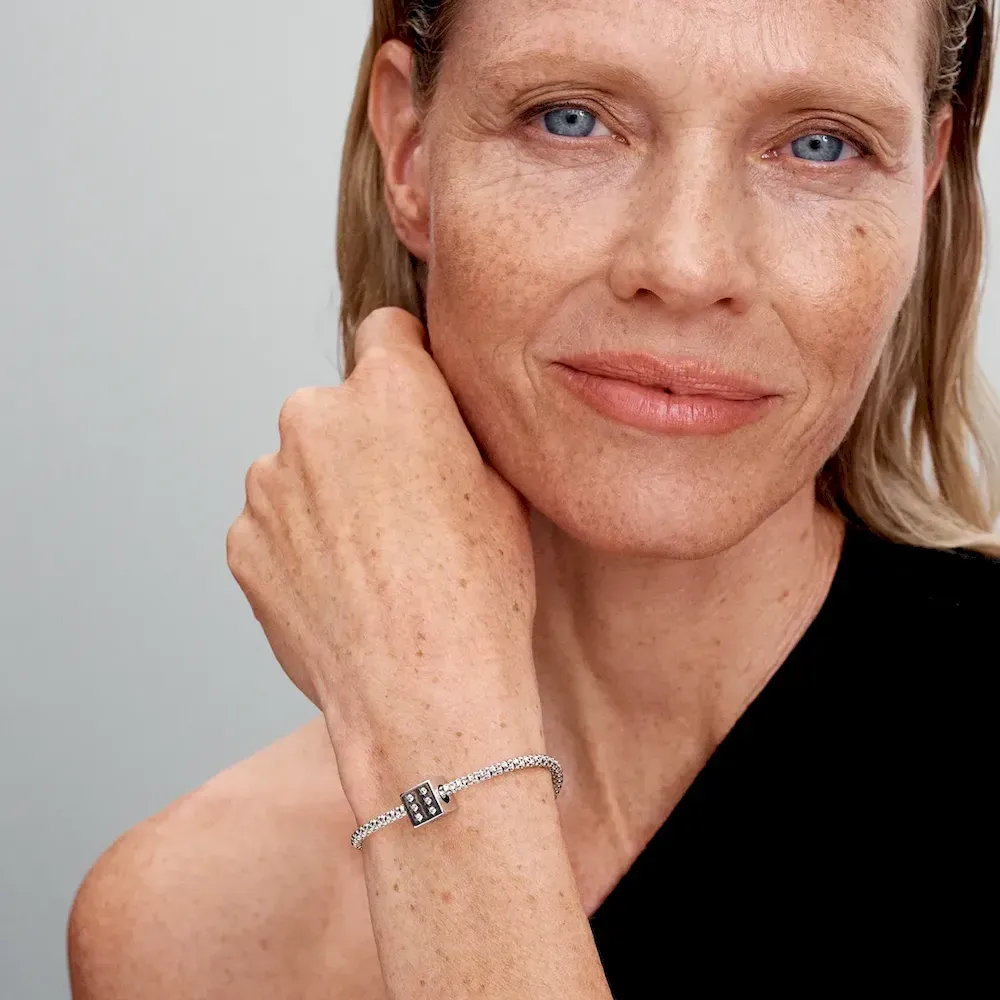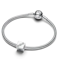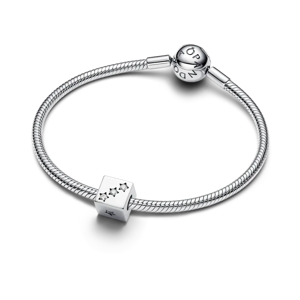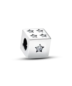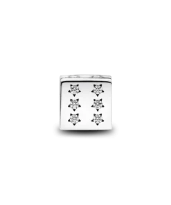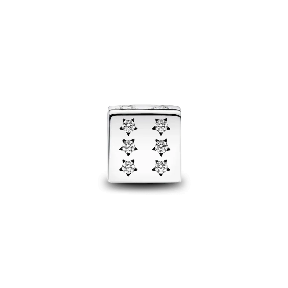 This six-sided sterling silver dice features round stones in star settings on each side representing numbers one, three, four and six.