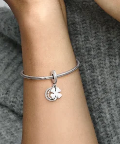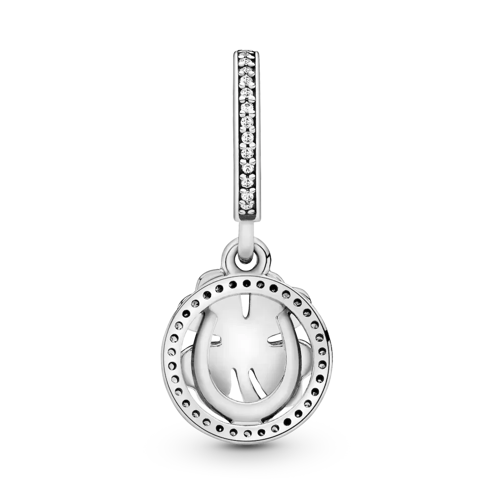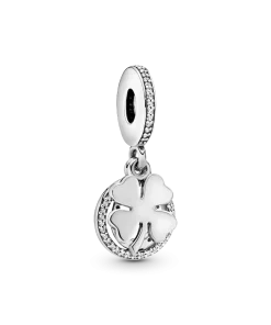 Our hand-finished dangle charm is a thoughtful way to wish someone special well, or a cool talisman of luck for a personal Pandora Moments bracelet. Cast from sterling silver, the feel good piece is shaped as a four-leaf clover set against a horseshoe framed by a stone-embellished circle. String it on a necklace or add it to a bracelet as a lucky charm.