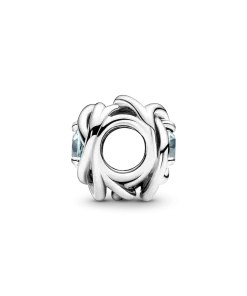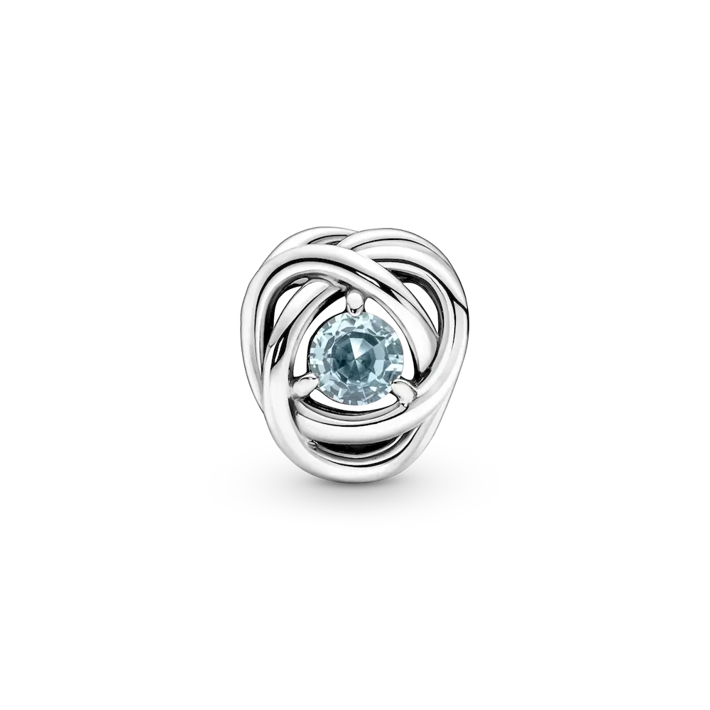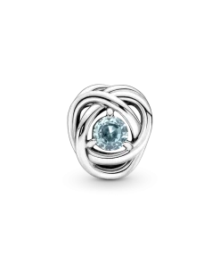 Celebrate March milestones with the Sea Aqua Blue Eternity Circle Charm featuring a man-made crystal reminiscent of the deep sea with a sterling silver infinity braiding pattern. The charm comes on a snake-chain patterned Pandora Moments Small O Pendant on a Classic Cable Chain Necklace in sterling silver.