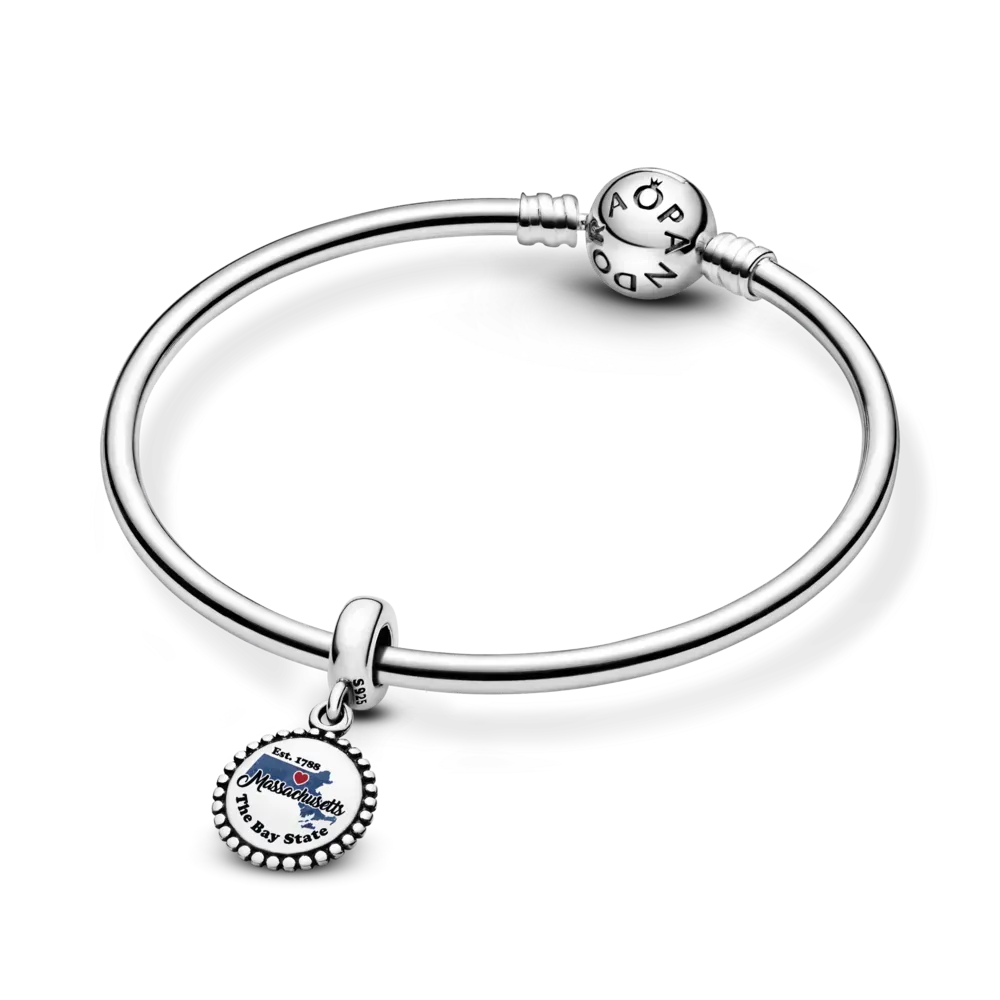 Your heart’s way of saying “I love you” to the Bay State. This sterling silver dangle charm features a state-shaped silhouette in glossy blue enamel with “Massachusetts” beautifully scripted in black, accented with a small white heart. Carry a piece of the place you love or gift it to someone who adores it just as much.