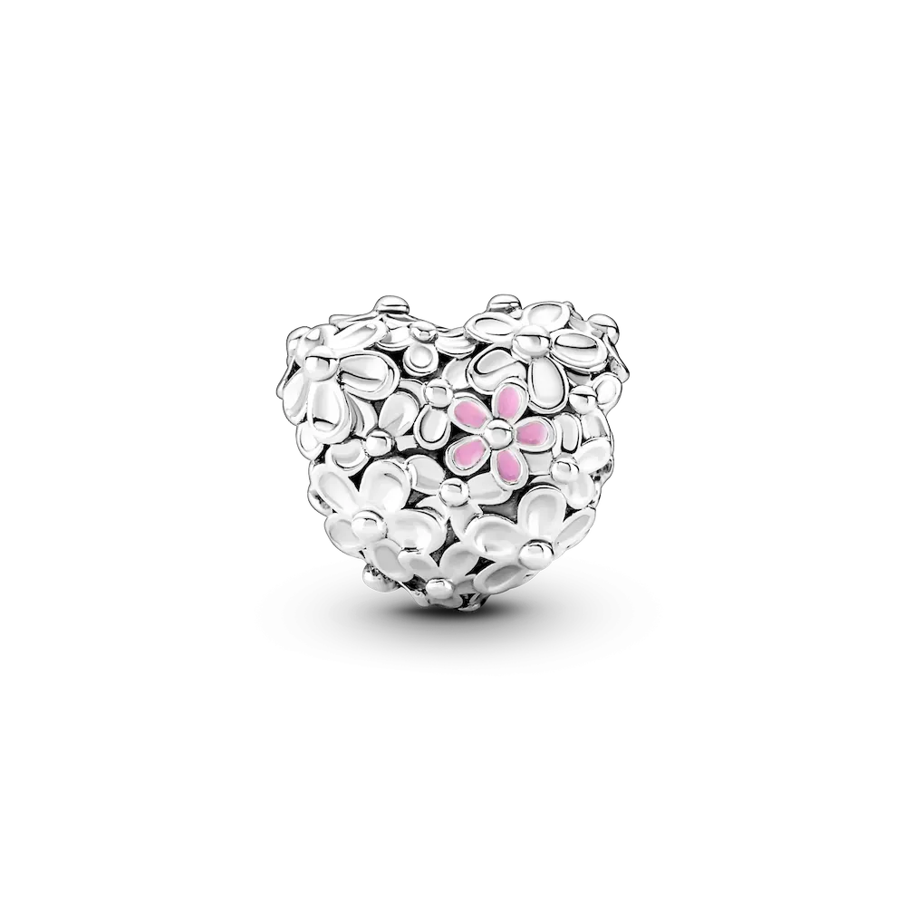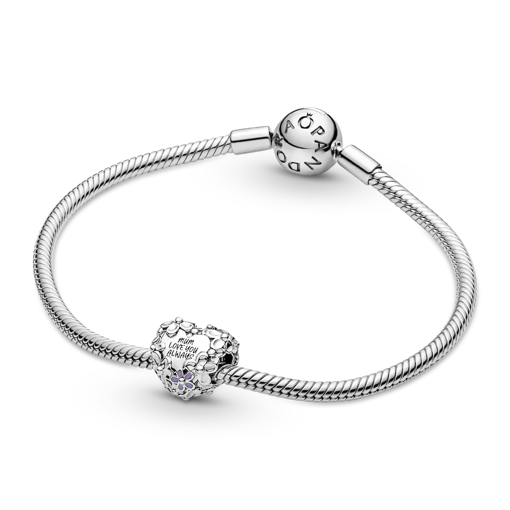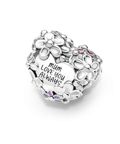 Give Mum flowers that last forever with the Mum Daisy Heart Charm. Crafted in sterling silver with pink and purple enamel, this charm is decorated with a wrapping of daisies to symbolize joy and abundance. The engraving reads