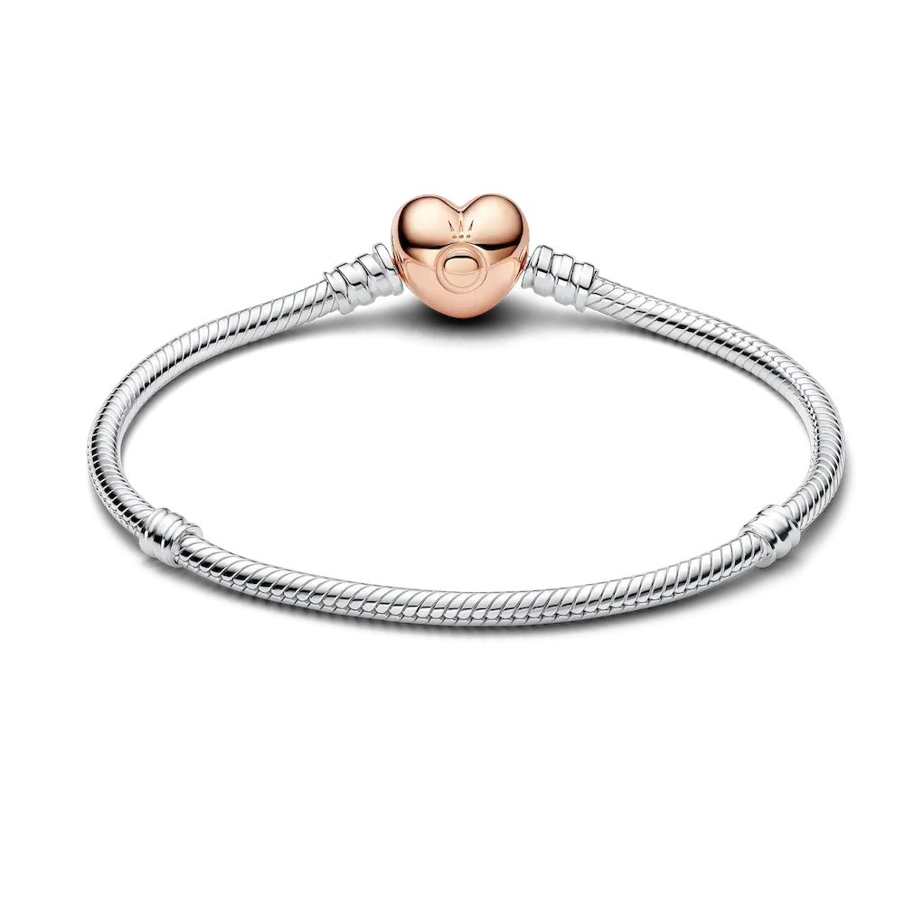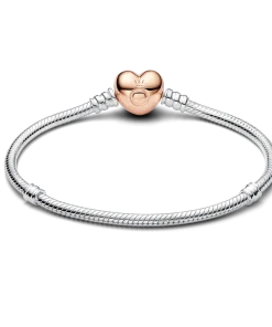 Set your heart a-flutter with this romantic version of Pandora’s bestselling charm bracelet. Hand-finished with a 14k rose gold-plated heart-shaped clasp, this sterling silver Moments Heart & Snake Chain Bracelet looks stunning on its own but even better adorned with your favorite Pandora Moments charms and clips. Layer it with contrasting Pandora chain bracelets for a chic, multi-layered look.