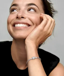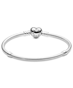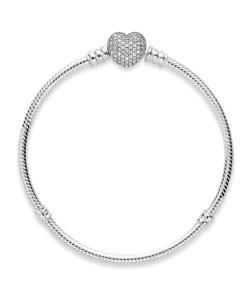 Add sparkle and romance to your charms with this stunning version of Pandora’s iconic snake chain bracelet. Hand-finished in sterling silver, this sleek style features a reversible heart-shaped clasp set with shimmering pavé stones on one side and embossed with the Pandora logo on the reverse. Simply turn the clasp to create two different looks. Wear this bracelet unadorned or filled with your favorite Pandora charms.