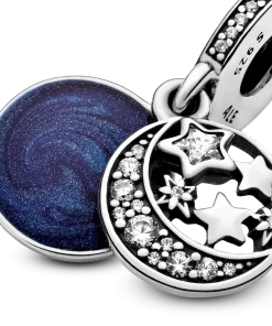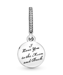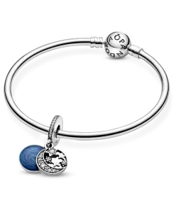 Express your love in the most beautiful way possible with this magical Moon & Blue Sky Dangle charm. Crafted in sterling silver, this exquisite piece features two double-sided pendants decorated with blue enamel, shimmering cubic zirconia stones, and the engraving “I love you to moon and back.” Wear it with other blue and sterling silver charms on a snake chain bracelet or as a single pendant on a Pandora necklace chain.