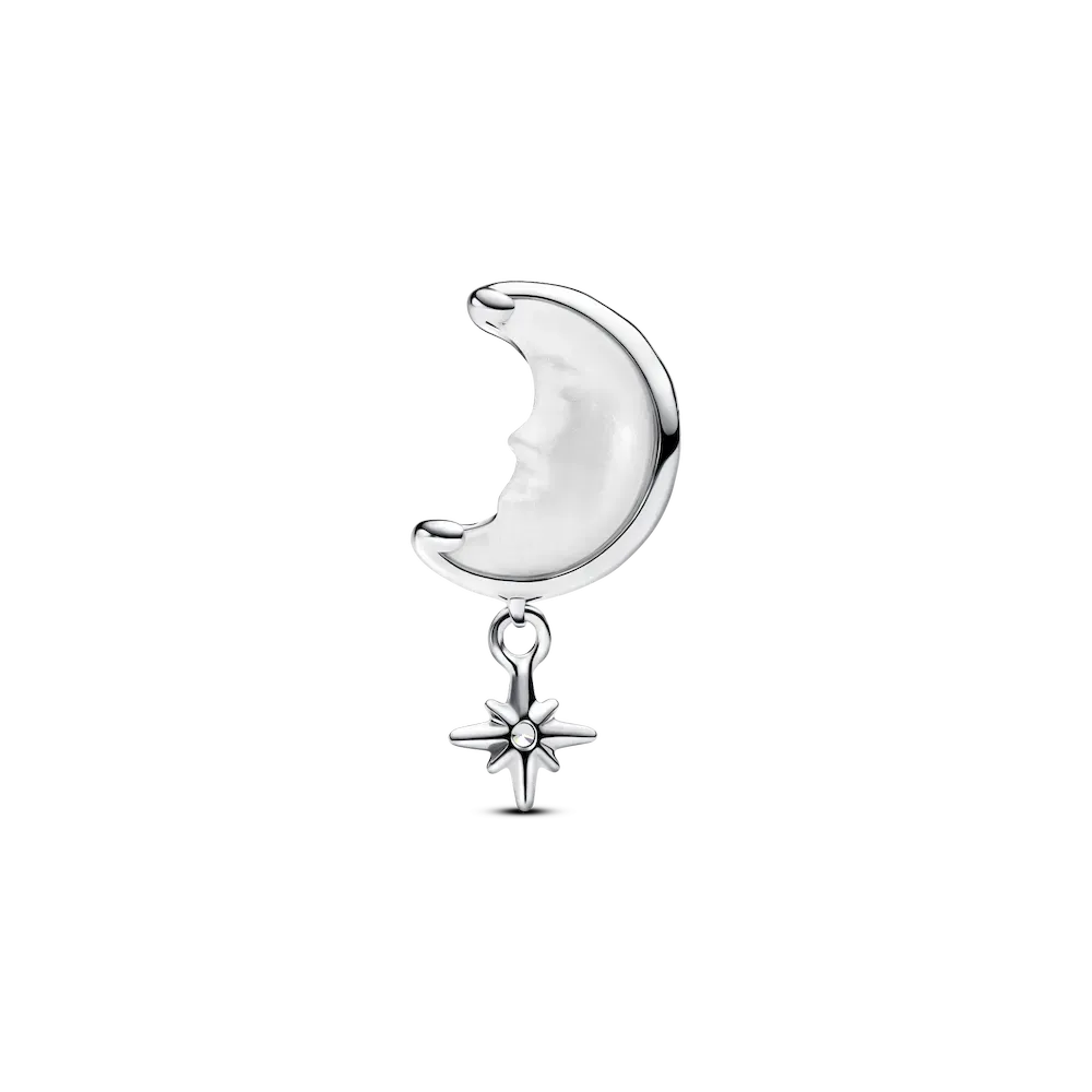 Let the night sky be your guide with our Moon and North Star Charm. The moon, crafted from man-made bioresin mother of pearl with peaceful facial details, rests in a sterling silver setting featuring cut-out stars. The North Star dangles beneath the moon, shining bright with a single brilliant-cut stone set in its centre.