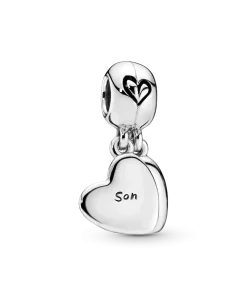 The bond between a mother and son is truly precious. Mark it with this meaningful split dangle charm, crafted in sterling silver and detailed with black enamel. The two-piece design is engraved on each heart with