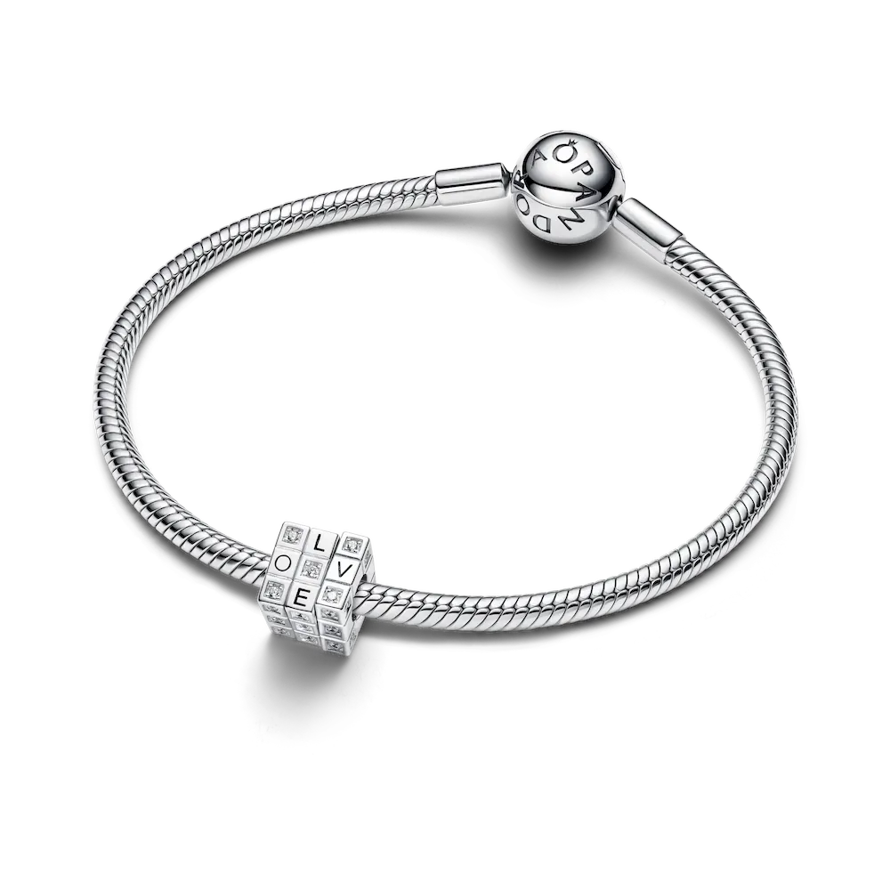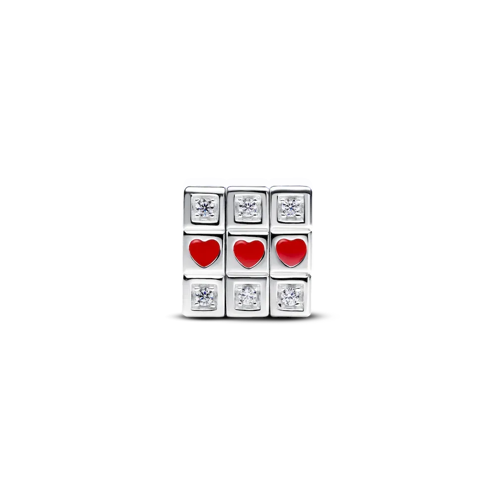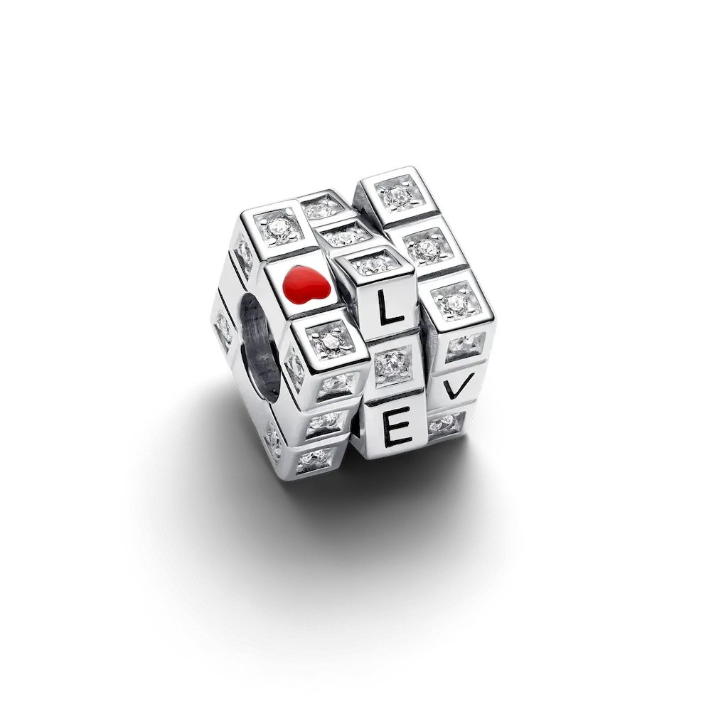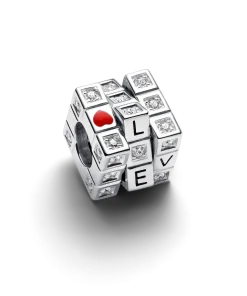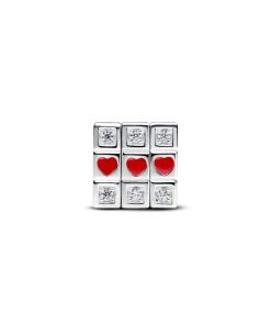 Play the game of love with our Moveable Toy Cube Charm. Crafted in sterling silver with red enamel hearts, sparkling stones and engraved letters on rotating cubes, you can create different combinations and patterns as you move the cubes around. Carry it as a symbol that love can be a puzzle the heart wants to solve.