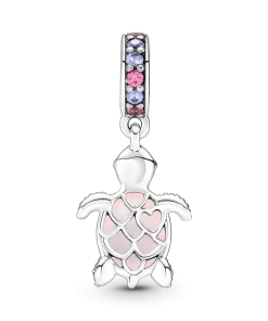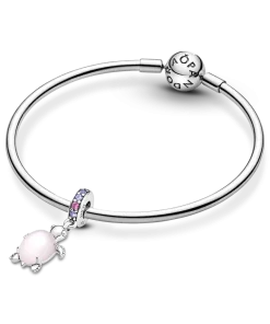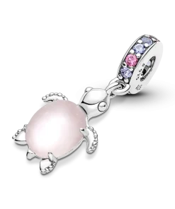 Our much-loved sea turtle charm is joined by a new friend in frosted pink. This sterling silver dangle charm features pink and purple man-made crystals on the bail and frosted Murano glass as its shell with unique shimmering flecks that catch the light. The belly of the sea turtle has a sterling silver cut-out pattern with an off-center heart to create a pretty scale-like effect. Carry more turtle friends on your Pandora Moments bracelet or charm holders.
