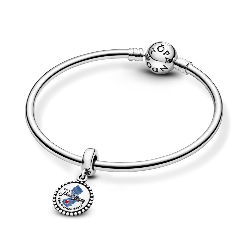 From the meadows and hills to its sandy shores, New Jersey’s charm is undeniable. Just as charming as this sterling silver dangle charm, featuring a state-shaped silhouette in glossy blue enamel, a small white heart, and “New Jersey” beautifully scripted across. Grow your collection with a token of the beloved Garden State.