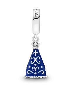 The principal patroness of Brazil, Our Lady of Aparecida is a famed clay statue and religious icon. Our sterling silver dangle charm is shaped to resemble the Catholic effigy and detailed with a blue enamel robe and beaded crown. Engraved with