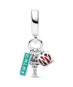 Mark your favorite memories with the NYC Apple, Torch and Street Sign Triple Dangle Charm. Carry the unmistakable atmosphere of the Big Apple with you with this sterling silver dangle charm featuring symbols of New York City. Combining a red Murano glass apple, the Statue of Liberty’s famous torch and the famous Fifth Av. street sign design in blue green enamel, this Pandora dangle charm symbolizes the endless dreams the city holds. Bring home a small piece of the big city for yourself or someone close to your heart.