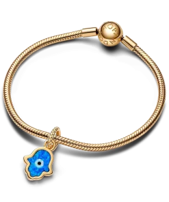 Ancient symbol, new vibe. Wear the Opalescent Blue Hamsa Hand Dangle Charm to represent protection and surrounding yourself with positive energy. This 14k gold-plated Hamsa charm showcases a shimmering deep blue lab-created opal. On one side is an openwork sun ray design radiating from an all-seeing eye motif at the center with white lab-created opal. Traditionally worn as a talisman to defend against evil, the dangling hand is a gesture of welcoming kindness, friendship and grace into your life.