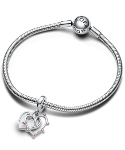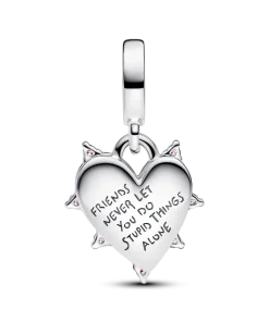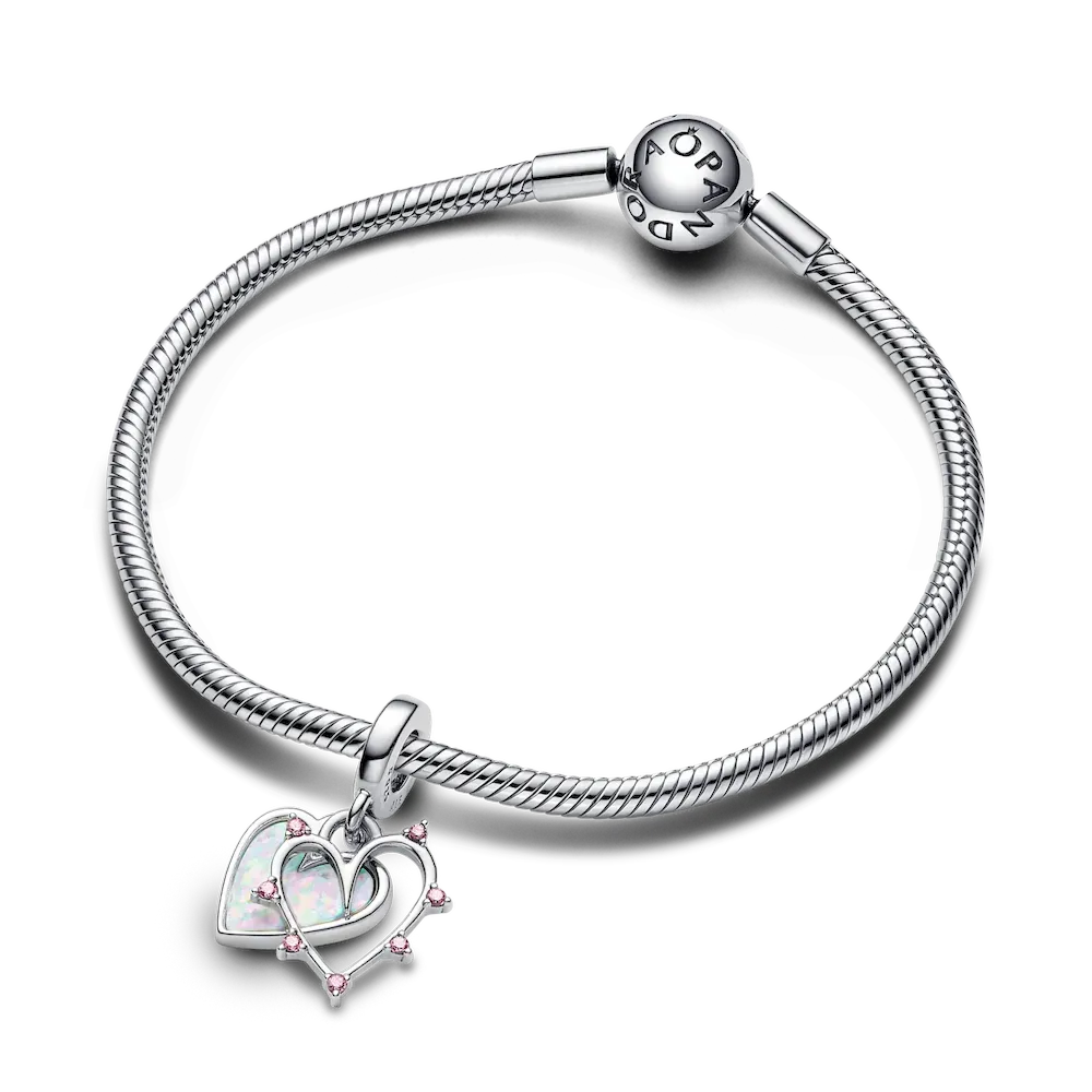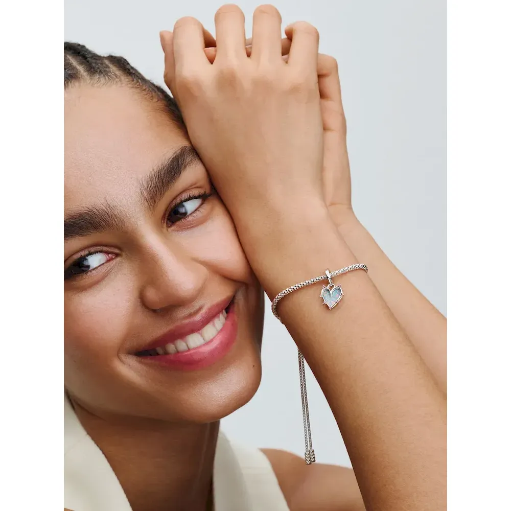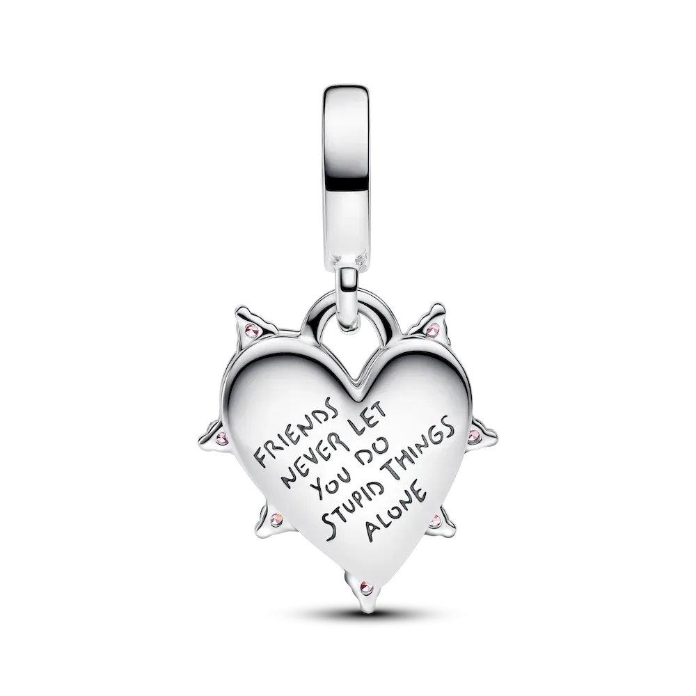 Inspired by a spectrum of iridescent colors, this Opalescent Charm Duo includes our new lab-created opal charm, now in a beautiful shimmering purple. Both hand-finished in sterling silver, the new Friendship Opalescent Double Dangle Charm features a delicate open heart punctuated with seven sparkling cubic zirconia stones set against pink lab-created opal. Engraved on the back is a handwritten message “Friends never let you do stupid things alone”. Thought to bring good luck, add these powerful elements of sparkle and positive energy to you or your besties mix.