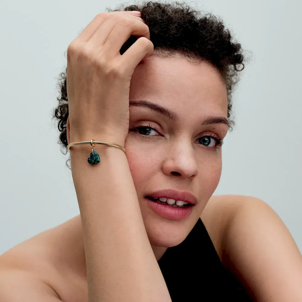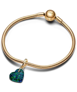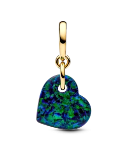 Channel the heart of the jungle with the Opalescent Green Heart Dangle Charm. A lab-created, heart-shaped iridescent opal features a spectrum of colors and streaks of glitter designed to evoke the vivid colors of the tropics. The heart hangs from an angle from a 14k gold-plated jump ring and pear-shaped bail. Pair this vibrant charm with other warm-toned styles to create a rich focal point and remind yourself of the wild, free-spirited energy of nature and summer.