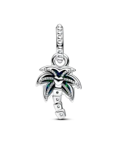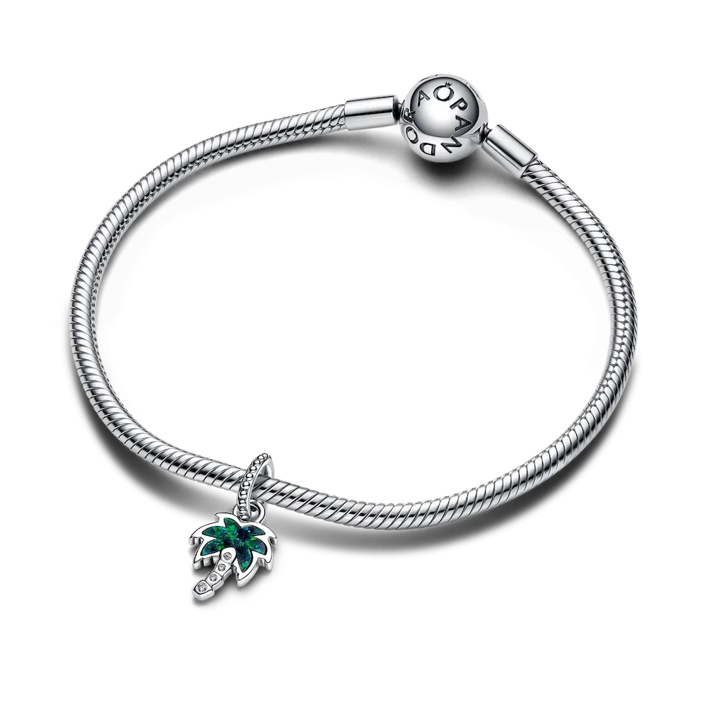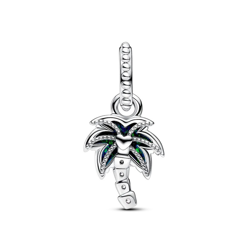 Bring an easy-breezy touch to your look with the Opalescent Green Palm Tree Dangle Charm. This sterling silver charm shaped like a palm tree features a lab-created opal with a glitter-streaked spectrum of green and blue hues on one side. On the other side, a raised heart is centered within a cut-out frame. The palm tree’s curved base is punctuated with sparkling stones. Accessorize any look with this tropical-inspired charm for a dose of feel-good island energy anywhere, anytime.