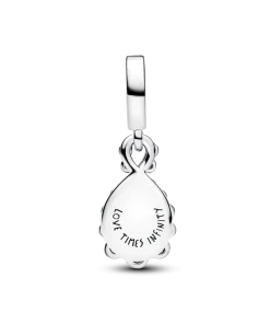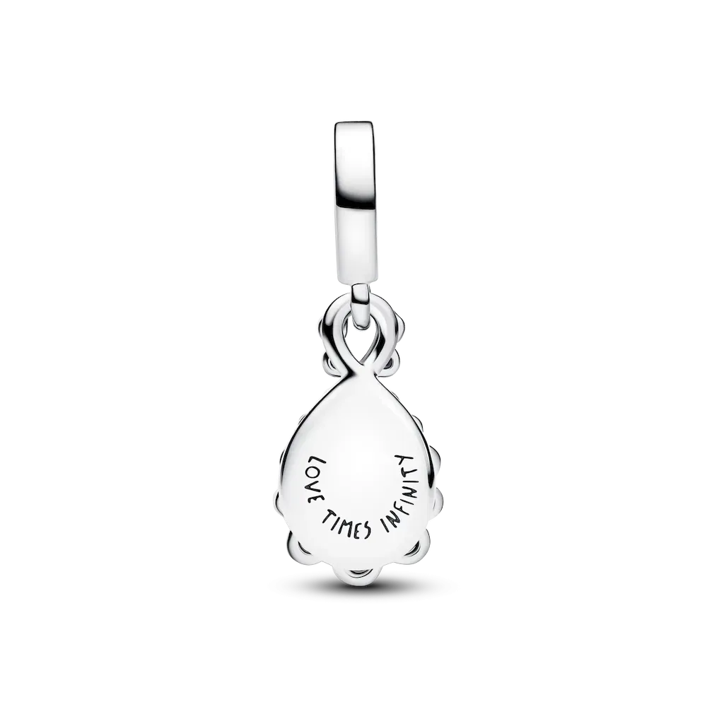 This sterling silver double dangle sparkles with clear cubic zirconia on one charm and aurora lab-grown opal resin on the other. Engraved with ‘LOVE TIMES INFINITY’, wear it as a reminder of everlasting connections.
