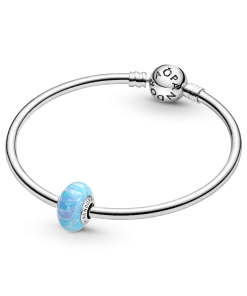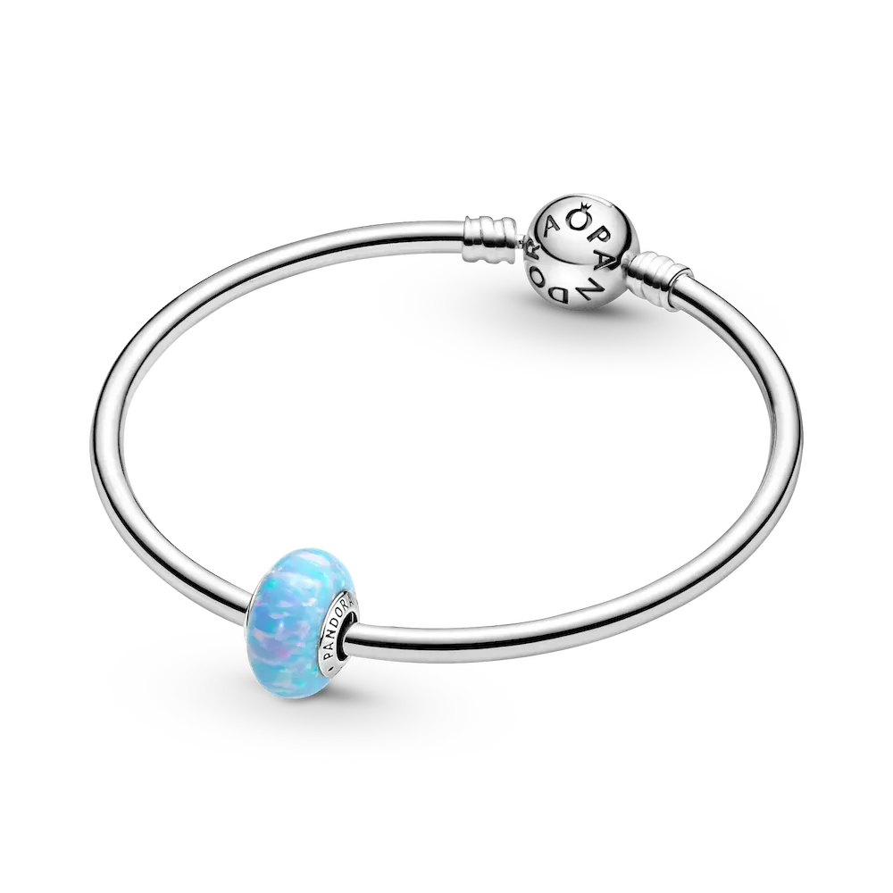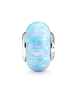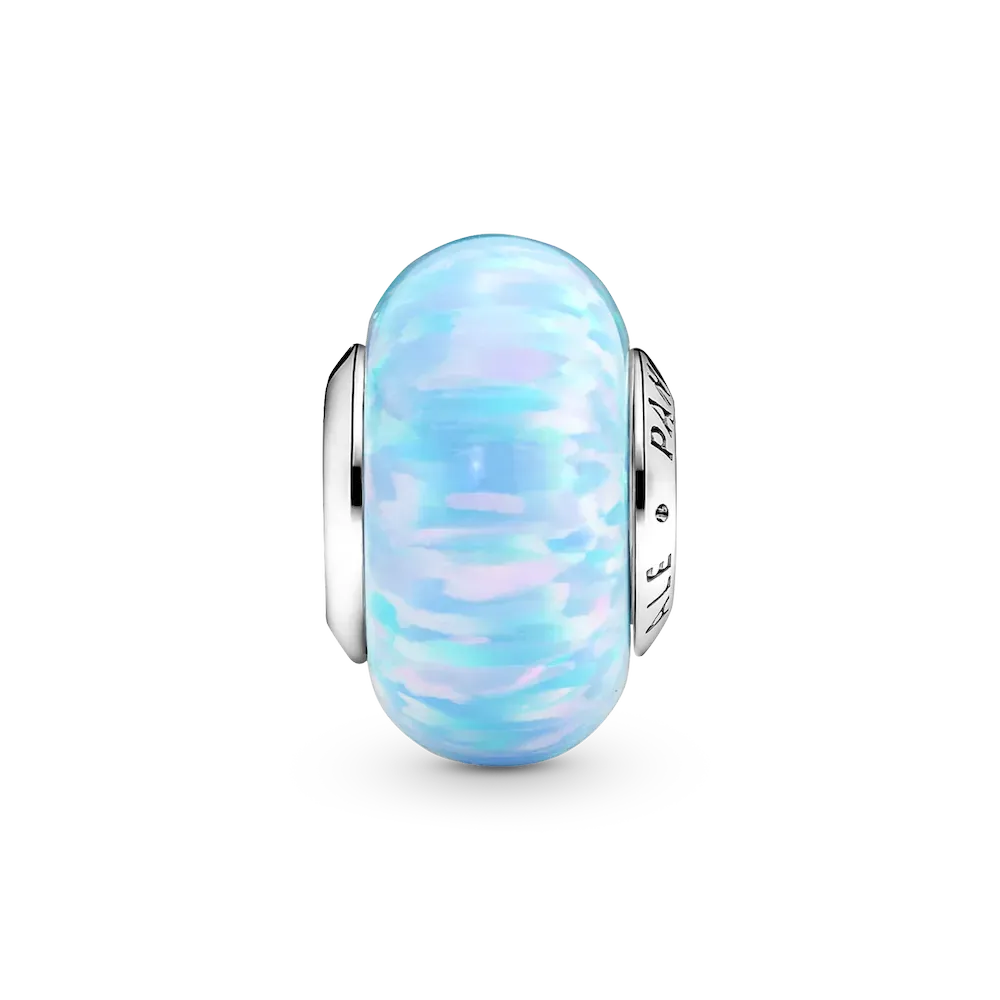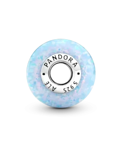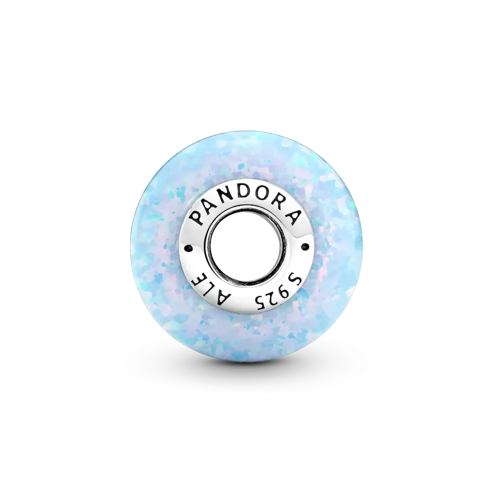 Inspired by shimmering blue ocean waves reflecting the summer sun, this beautiful lab-created opal charm is the perfect addition to your summer look. It features a sterling silver core with the Pandora logo on one side, surrounded by a lab-created opal shimmering with soft colors and glittering streaks. Each stone is unique, just like you.
