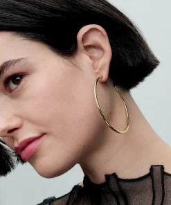 Add a style staple to your collection with the Open 65 mm Hoops. Crafted of our 14k gold-plated unique metal blend, these hoop earrings feature a round profile, flat ends and heart-shaped butterfly backs. Inspired by nature’s organically beautiful forms, these simple and sculptural earrings bring a fresh take on modern minimalism. These round open hoop earrings will be an effortless addition to your collection that can complement any mood and elevate any look.
