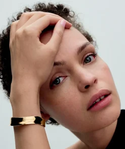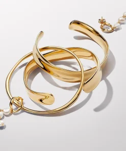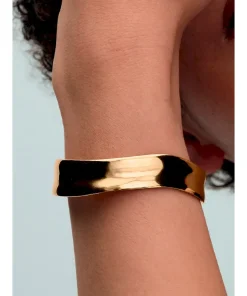 The Organically Shaped Broad Open Bangle is a chunky style essential. This 14k gold-plated bangle features a wavy profile that varies in thickness, with slightly convex and concave details along the surface and rounded edges at the bangle’s opening. Pair this chunky bangle with delicate styles to create interesting contrast, or let it stand alone as a statement piece. The bangle is precisely sized for optimal wear and fit and is not designed to be flexed or twisted.