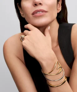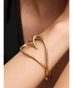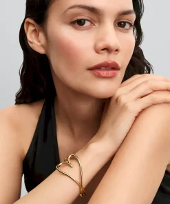 A sculptural statement piece. 14k gold-plated metal flows in a continuous line around the wrist, forming an open bangle with an oversized heart motif. Pair it with the matching earrings and ring for a modern take on an enduring symbol of love.