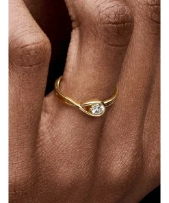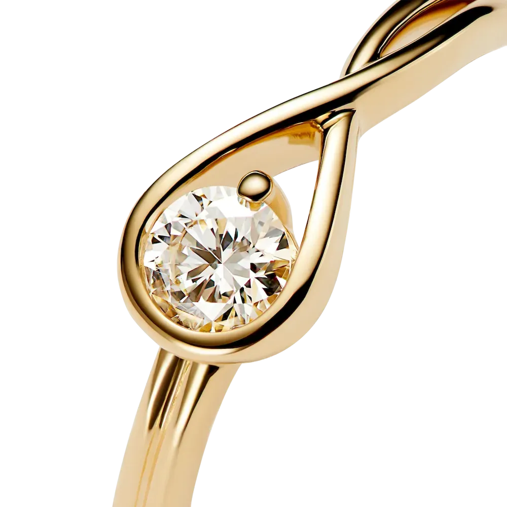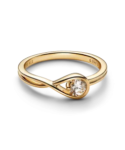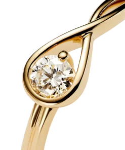 A solid 14k yellow gold ring hand set with a 0.25 carat lab-grown diamond. A beautiful statement of empowerment and possibility, or a simple yet eloquent declaration of love. This ring features a scintillating round brilliant excellent cut lab-grown diamond in a modern infinity setting that flows seamlessly around the stone. It can be worn alone or stacked with other rings from the Pandora Infinite collection. Each Pandora Lab-grown diamond is treated with a post-growth color enhancement called annealing.