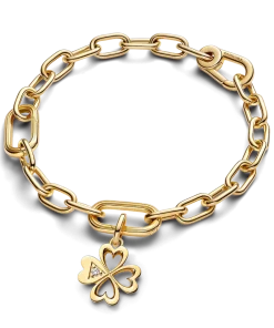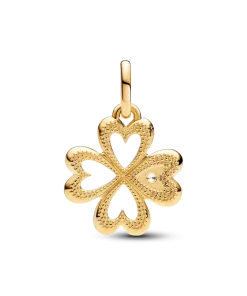 Get lucky with the Pandora ME Heart Four-leaf Clover Medallion Charm. With four heart-shaped leaves, this 14k gold-plated clover medallion charm has two distinctly different sides. One side is polished with three cut-out hearts and one solid heart set with a sparkling stone inside an triangle detail; the other side is covered in a microbead pattern on all four leaves. This clover medallion charm will bring a golden glow to your look while reminding you that you make your own luck. Compatible with Pandora ME and Pandora Moments.