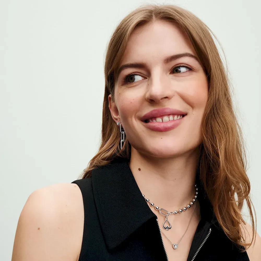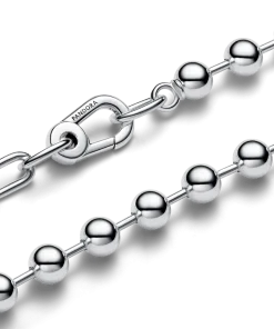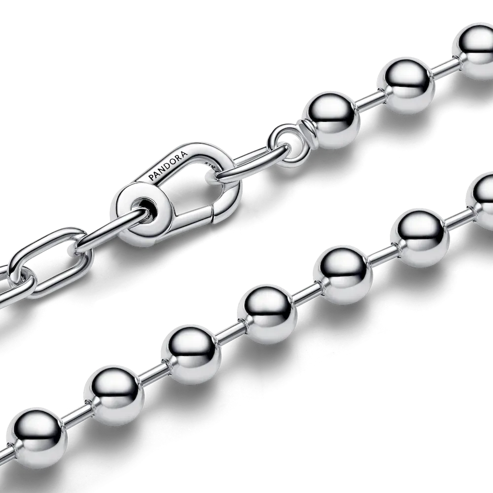 The Pandora ME Metal Bead & Link Chain Necklace proves that opposites attract. Pairing two essential styles – metal beads and chain links – this sterling silver necklace can be customised by styling the links with mini dangle charms or medallion charms. Balancing 90s punk rock influences with the timelessness of sleek silver, this statement necklace can stand alone or be paired, layered and styled in fresh ways every day.